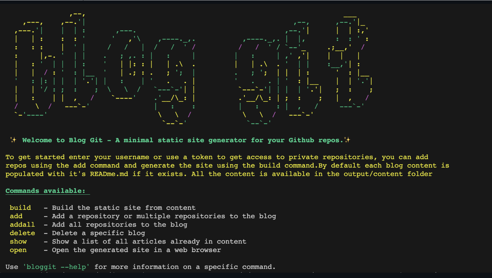 BlogGit is a command-line static site generator that allows users to create personal blogs from their GitHub repositories. It fetches repository information and converts it into a static HTML site and is designed with tailwindCSS.