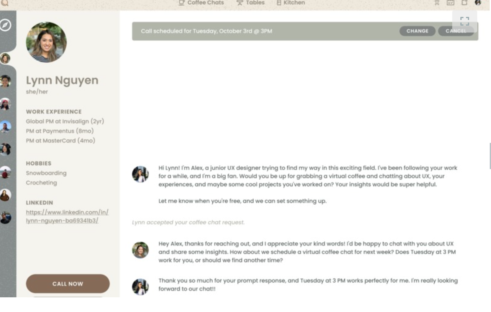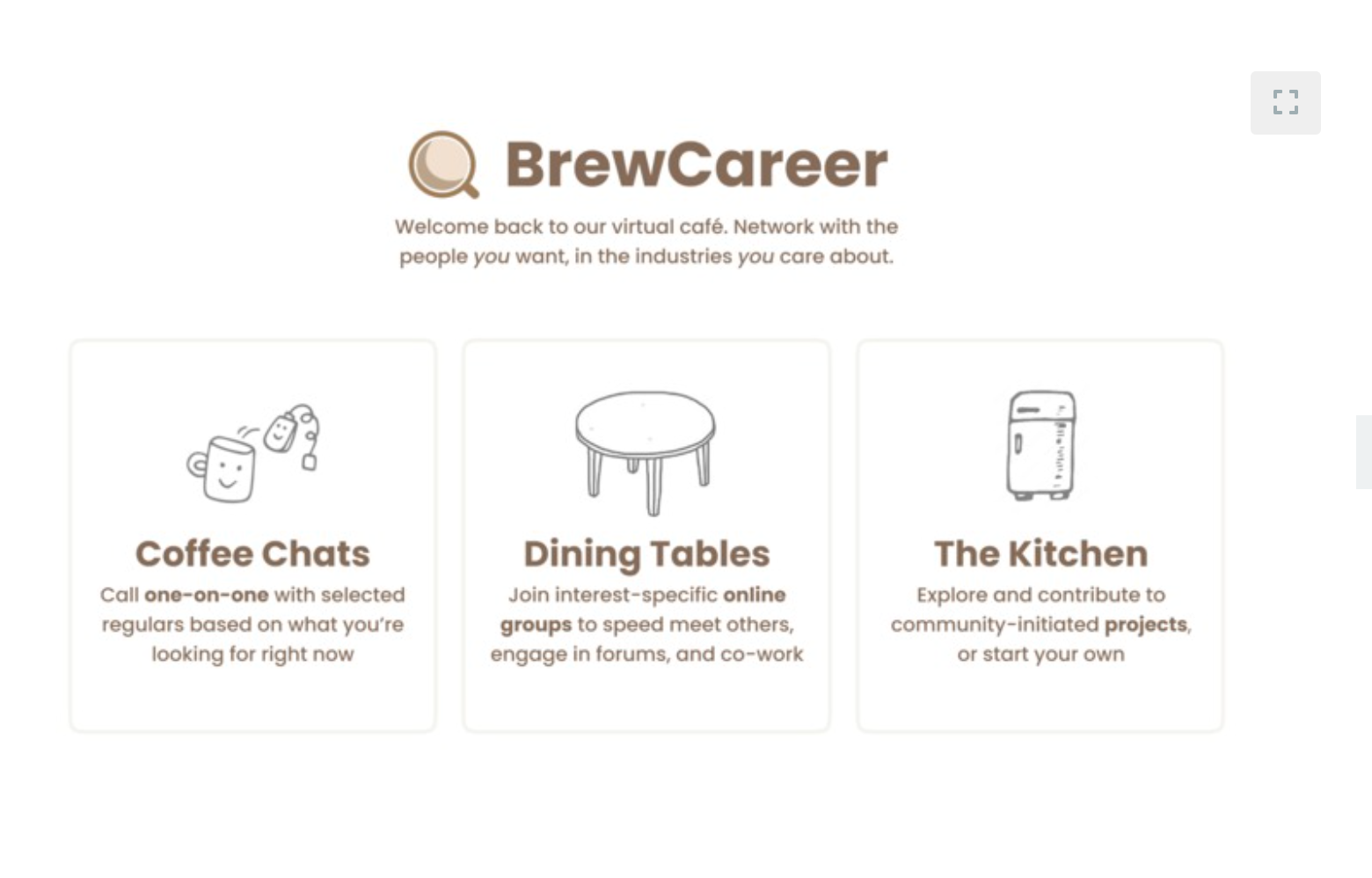 My first design hackathon, we wanted to build a space where students can come in and "Brew" a career by networking with mentors and industry specilists. We played with the virtual cafe theme and built spaces for "coffee chats", "Dining tables" for online grooups , "Kitchen" to explore and create community driven projects.