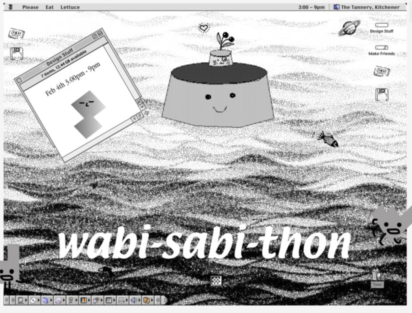 A project to design an advertisement for Wabi-sabi-thon.We were curious to play around with vintage macOS, and iconic software like HyperCard, Photoshop 1.0 + 3.0, and MacPaint. Using a combination of emulation + later some Figma, we made some neat assets and a poster for wabi-sabi-thon.